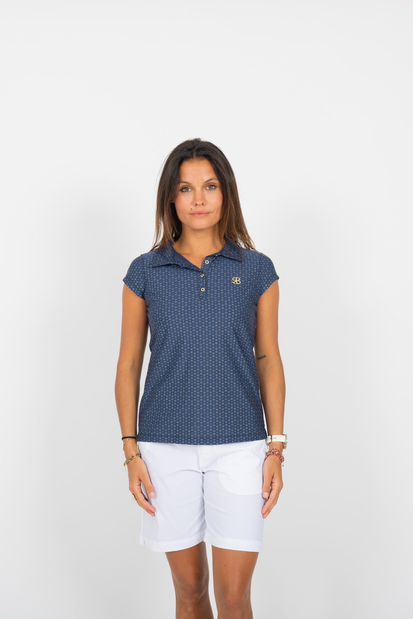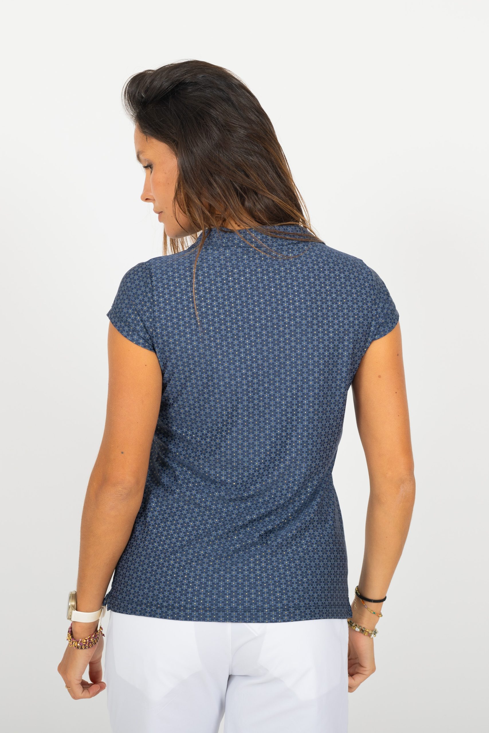 Un polo unique avec son motif floral marine et doré, il vous fera une silhouette féminine tout en vous apportant légèreté et confort pour vos longues partis d’été.